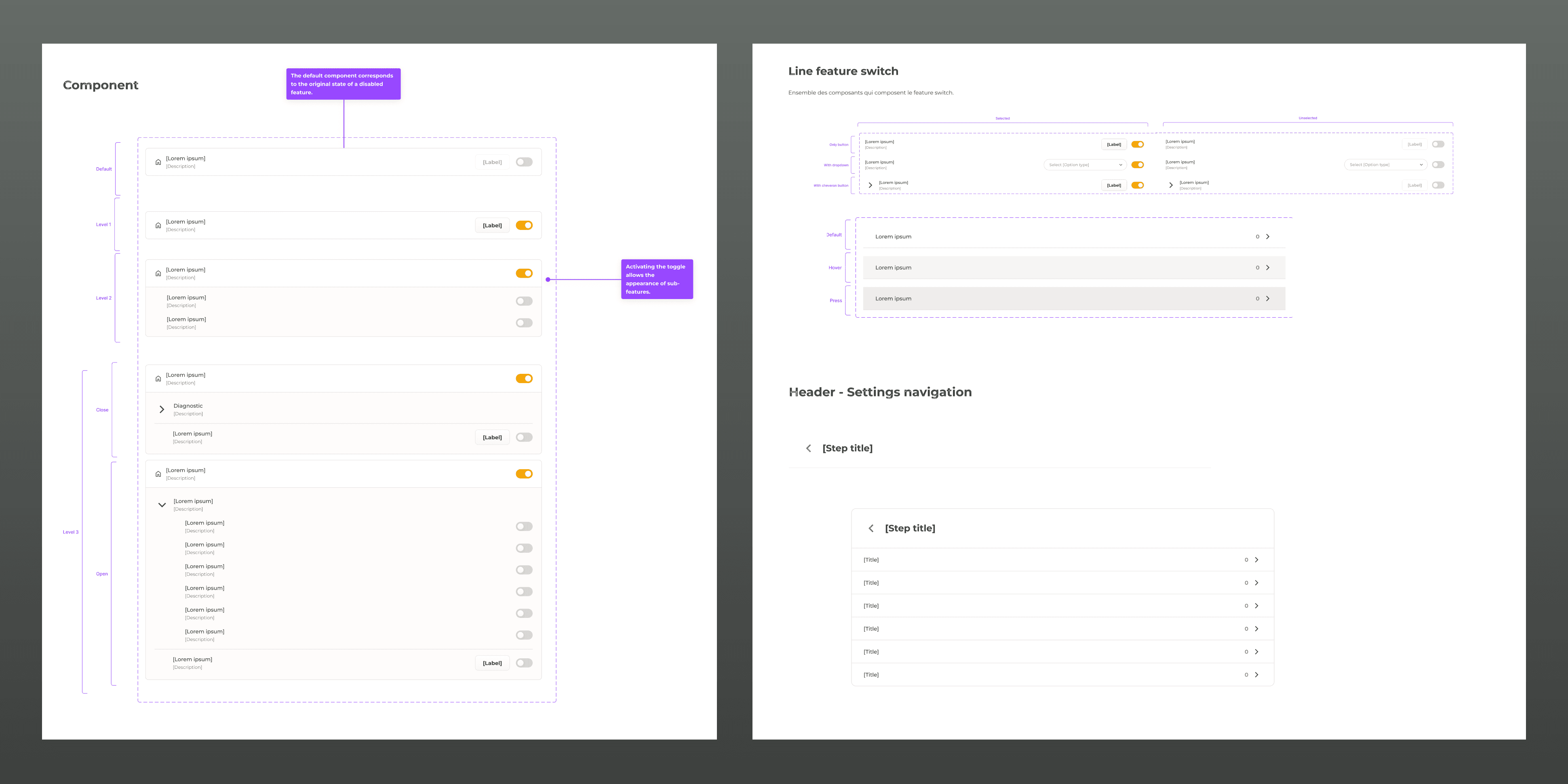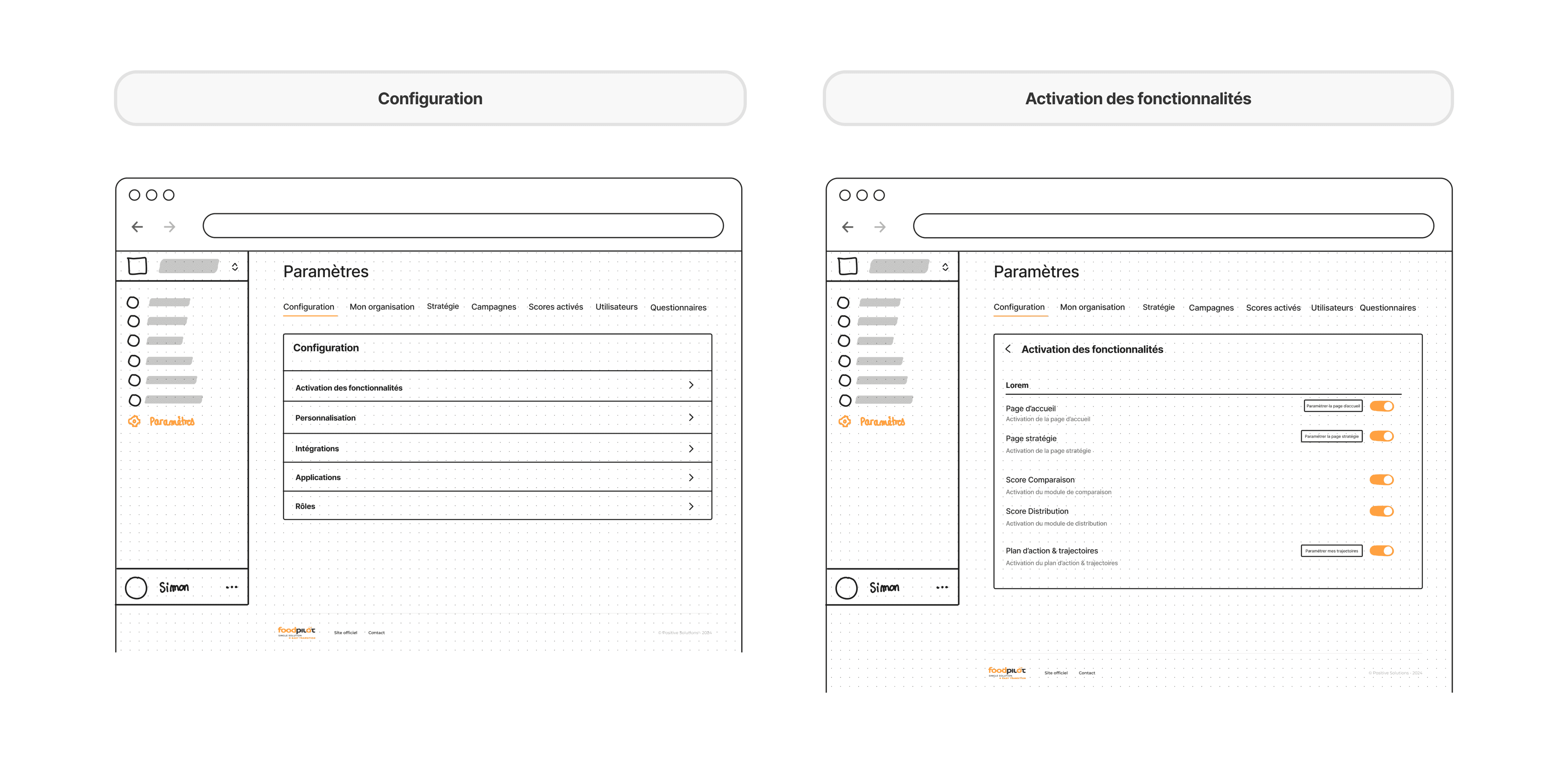 La phase finale a consisté à produire les maquettes Hi-Fi. J'ai mis en place un système de composants réutilisables (boutons, cases à cocher, headers de section) pour assurer une cohérence visuelle sur l'ensemble des pages de paramètres et faciliter le travail d'intégration des développeurs.