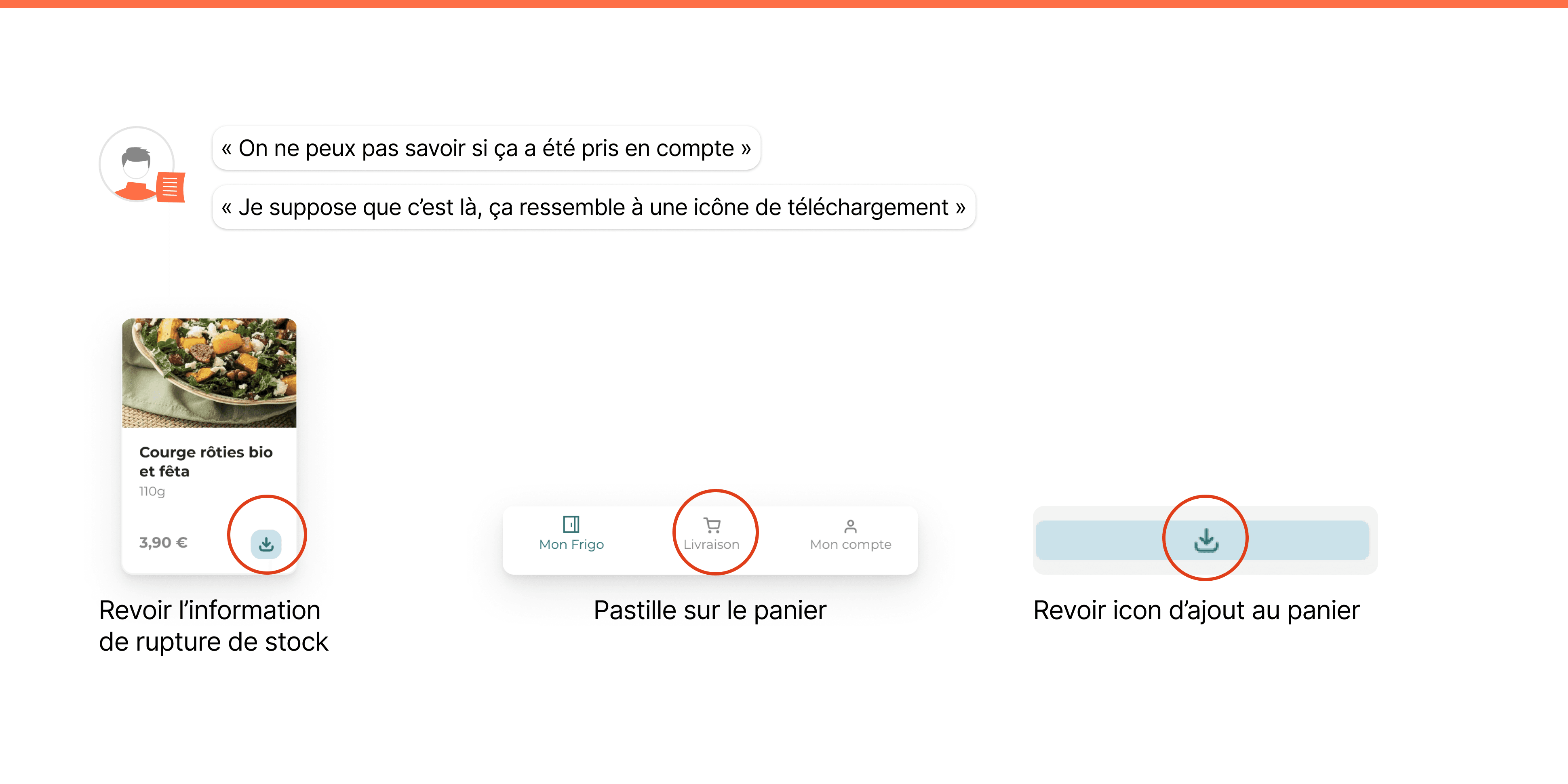 "Nous pensons que l'icône actuelle d'ajout au panier doit être remplacée, car elle ressemble à une icône de téléchargement. Nous saurons que c'est vrai si 2/3 des testeurs bloquent ou expriment une incompréhension."